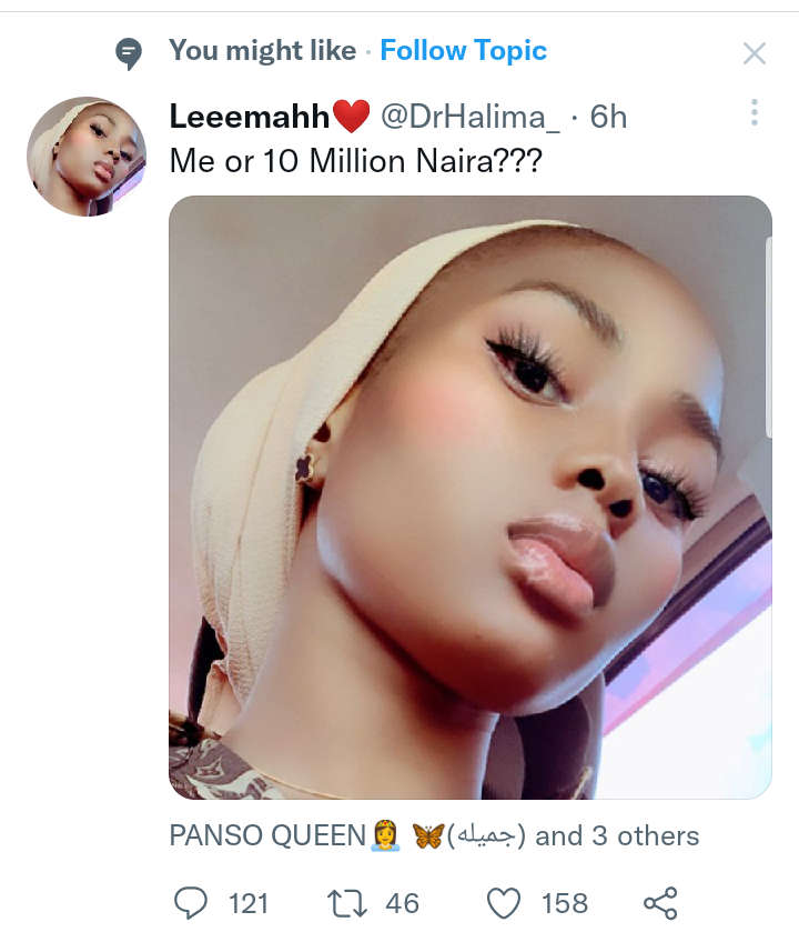 Yau dai nun ci karo da hoton wata matasahiya kyakkyawa son kowa ƙin wanda ya rasa, mai suna Dr. Haleemat inda ta sanya hoton ta sannan tayi wani ɗan taƙaitaccen rubuta da harshen turanci, cewa,”Ni ko miliyan goma”.