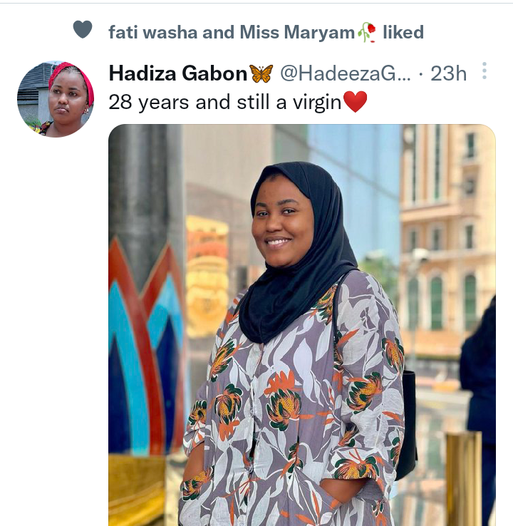 Jaruma Hadiza Aliyu Gabon ta ce shekarar ta 28 kuma har yanzu ita budurwa ce kamar yadda ta bayyana a shafinta na Twitter ga Screenshot ɗin nan daga ƙasa