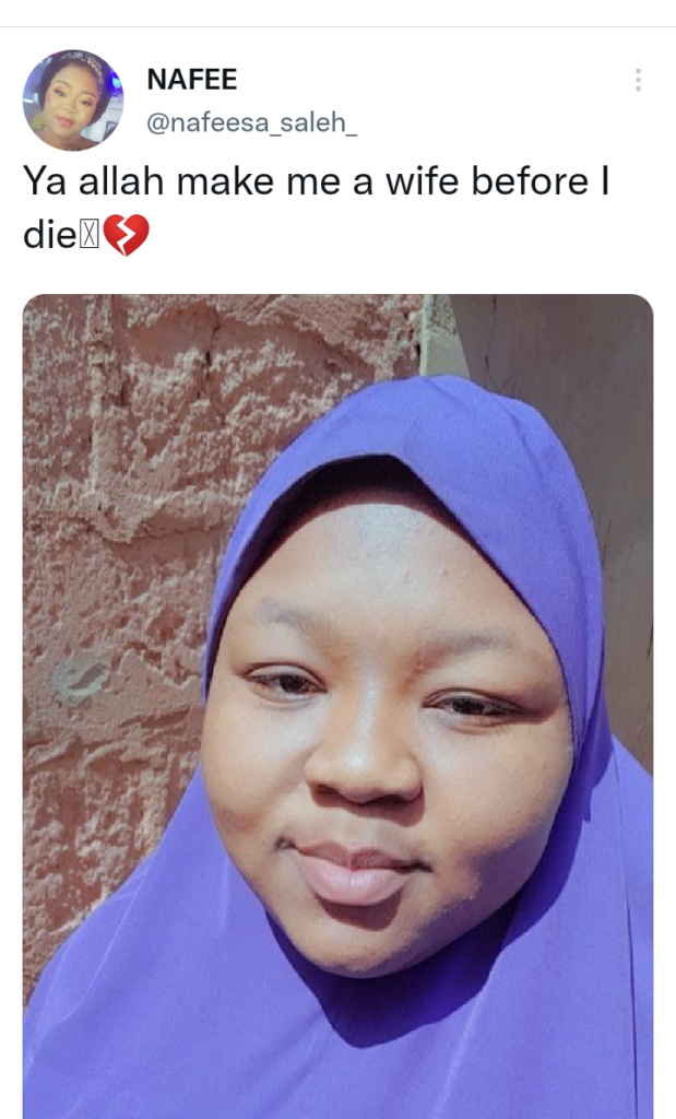 Wata matashiya mai suna Nafeesa Saleh ta yi wani rubutu a shafinta na Twitter inda ta ce “Ya Allah ka sa in zama matar aure kafin in mutu” ga Screenshot ɗin rubutunta nan daga ƙasa